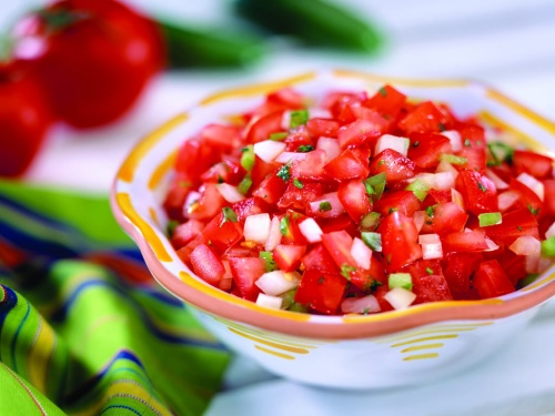 You can adjust the heat and any ingredients to suit your taste. It's a fresh, uncooked mixture of chopped tomatoes and onions, cilantro, fresh chiles, lime juice, and salt. If you like plenty of heat, add some finely chopped jalapeno or serrano.